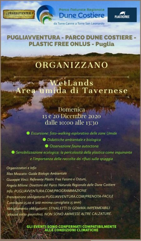 Il Parco naturale regionale delle Dune Costiere, in collaborazione con PugliAvventura e Plstic Free Onlus – sezione di Fasano, organizza WetLands, il ciclo d’incontri di educazione ambientale incentrato sulla tutela delle aree umide. I primi due appuntamenti si terranno nella mattinata di domenica 13 e 20 dicembre, presso l’area umida di Tavernese interna al perimetro del Parco Dune Costiere.