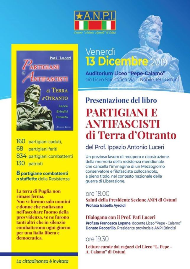 Si svolgerà venerdì 13 dicembre prossimo, a partire dalle ore 18, presso l’Auditorium del Liceo “Pepe-Calamo” di Ostuni (ingresso su Viale dello Sport, angolo Via Tommaso Nobile), la presentazione del volume “Partigiani e antifascisti di Terra d’Otranto” del professor Ippazio Antonio “Pati” Luceri, storico e militante politico.
