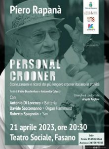 Piero Rapanà, ostunese, la massima espressione nostrana della poesia musicale, pilastro della musica da night degli anni 70 sarà il protagonista di “Personal Crooner”, evento in programma venerdì 21 aprile alle 20.30 al Teatro Sociale di Fasano organizzato dal Gruppo di attività teatrali “Peppino Mancini” con i testi di Fabio Bocchinfuso e dell’attrice e interprete Antonella Colucci. A condurre la serata sarà Angela Anglani.