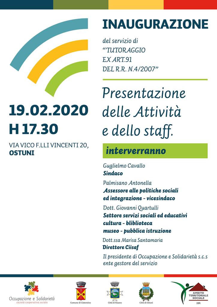 Sarà inaugurato mercoledì prossimo 19 febbraio alle ore 17.30 il nuovo servizio di tutoraggio istituito dal Comune di Ostuni nel rispetto della legge regionale 4/2007. La sede che accoglierà il servizio, gestito dalla Cooperativa Sociale Occupazione e Solidarietà di Bari, in stretta collaborazione con il Comune di Ostuni e  con il Consorzio per l’integrazione e l’inclusione Sociale – ambito di Fasano C.I.I.S.A.F., si trova in via Fratelli Vincenti 20, nei pressi di via Giovanni XXIII.