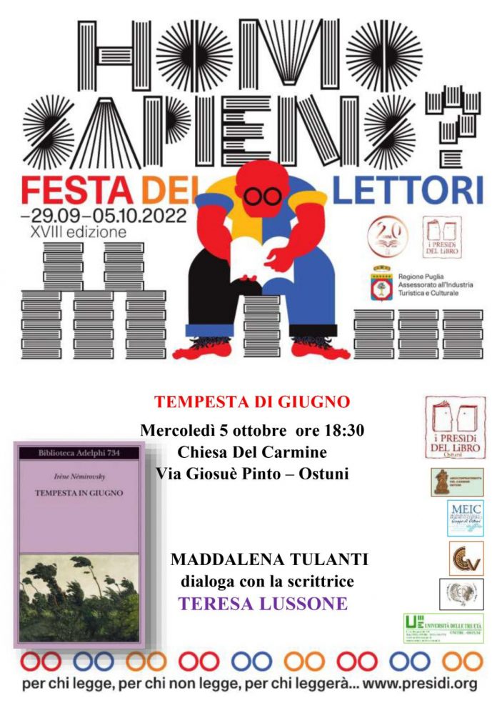Mercoledì 5 ottobre, nell’ambito della diciottesima edizione della Festa dei Lettori de I presidi del libro, presso la Chiesa del Carmine, alle ore 18:30 sarà presentata la nuova edizione della prima parte di “Suite Française” di Irène Némirovsky, dal titolo “Tempesta in giugno” (Adelphi Ed.).