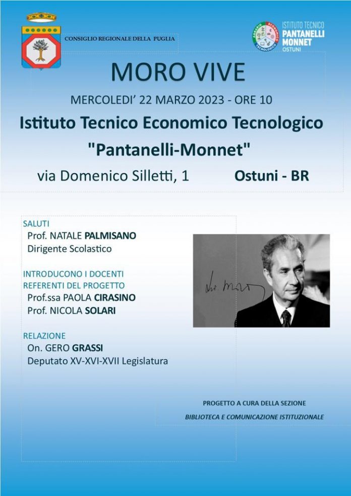 Come ormai consuetudine l’Istituto Pantanelli-Monnet di Ostuni ospiterà mercoledì 22 marzo alle ore 10:00 l’On. Gero Grassi, che incontrerà gli studenti a pochi giorni dall’anniversario del rapimento di Aldo Moro.