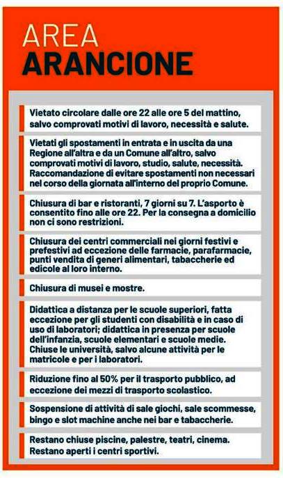 Le zone arancioni sono soggette alle disposizioni inserite nel Decreto del Presidente del Consiglio dei Ministri del 3 novembre, consultabili sul sito della Regione Puglia nella tabella predisposta nella pagina Zone rosse, arancioni e gialle dello Speciale Coronavirus.