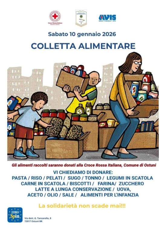 Per questo, sabato 10 gennaio 2026, il Lions Club Ostuni Città Bianca, insieme alla Croce Rossa Italiana – Comitato di Ostuni e all’AVIS Ostuni, promuove una grande Colletta Alimentare presso l’Eurospin di Ostuni (via dott. G. Tanzarella, 8), dalle ore 10.00 alle 13.00 e dalle 17.00 alle 20.30.