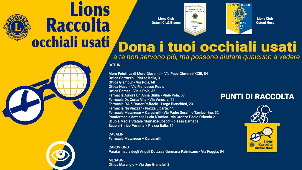 Ottobre è il mese della sensibilizzazione all’importanza della vista e per questo il Lions Club Ostuni Città Bianca ed il Lions Club Ostuni Host hanno deciso, per il secondo anno consecutivo, di unire le forze a favore del Centro Italiano Lions per la Raccolta degli Occhiali Usati, che dal 2003 si occupa, tutti i giorni, di raccogliere occhiali usati e di rimetterli a nuovo donandoli a chi ne ha bisogno.