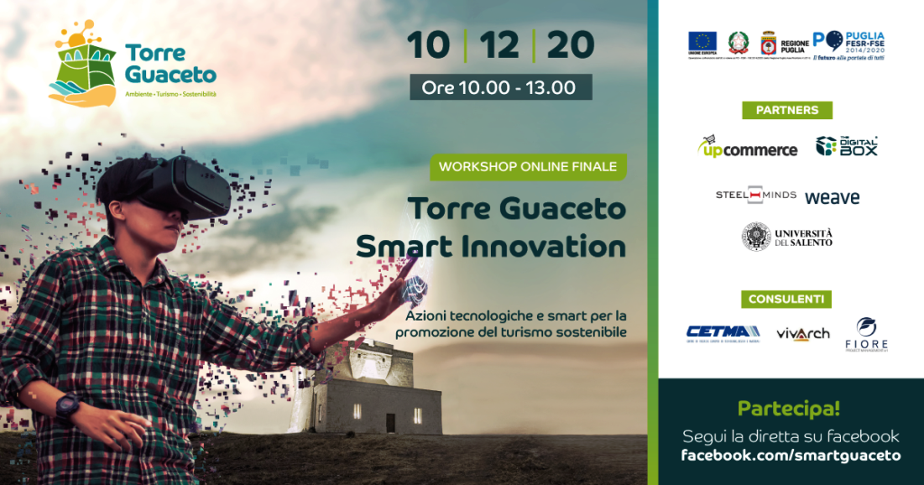 Prenderanno parte al workshop rappresentanti della Regione Puglia, del Consorzio di Gestione di Torre Guaceto, i partner UpCommerce, The digital box, Weave, Steel Minds, Università del Salento ed i consulenti che hanno seguito passo passo i lavori Cetma, Vivarch e Studio Fiore.