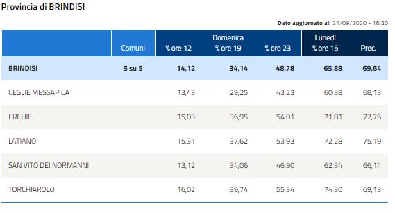 Sono cinque infine i comuni al voto in provincia di Brindisi per il rinnovo di sindaco e consiglio comunale. Il dato medio relativo all’affluenza è del 65.88%, come riporta la piattaforma del Ministero dell’Interno dedicata alla pubblicazione dei dati.