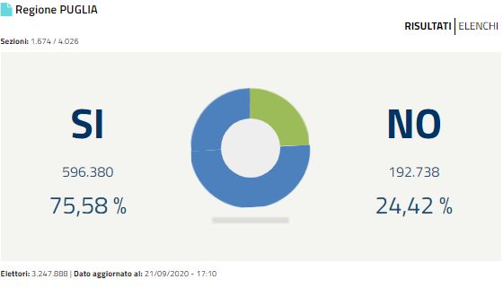 In Puglia ha votato complessivamente il 61,66% degli aventi diritto per il Referendum, mentre per quanto riguarda le regionali si è presentato il 56,20% dell’elettorato.