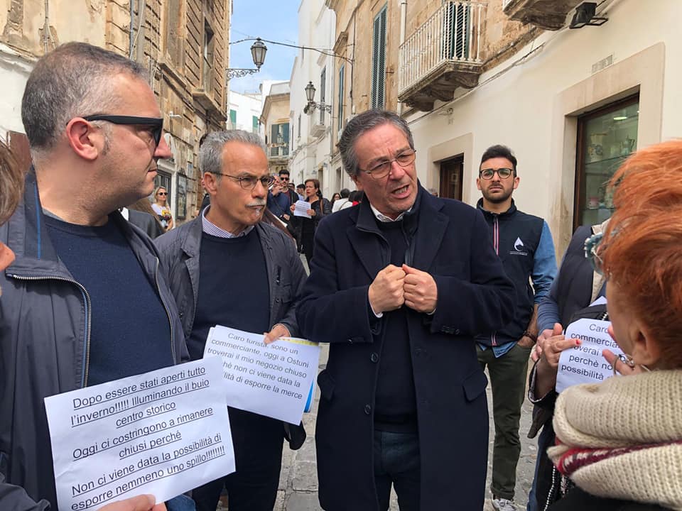 Gli esercenti di via Cattedrale sono scesi in strada a protestare contro la mancata messa in atto di regole chiare che regolamentino una volta per tutte l’occupazione di suolo pubblico. Gli esercenti esponevano cartelli che recavano la seguente dicitura: “Caro Turista, sono un commerciate di Ostuni, oggi troverai il mio negozio chiuso perché non ci viene data la possibilità di esporre la merce. Dopo essere stati aperti tutto l’inverno illuminando il buio centro storico oggi ci costringono a rimanere chiusi perchè non ci viene data la possibilità di esporre nemmeno uno spillo”.