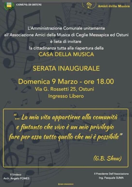 Il prossimo 9 Marzo alle ore 18.00, riapre le porte la Casa della Musica di Ostuni. La struttura di via G. Rossetti torna in funzione grazie alla volontà dell’Amministrazione Comunale che ne ha affidato la gestione, pro tempore, all’associazione Amici della Musica, al fine di rendere questo luogo uno spazio aperto e animato, fruibile ed a disposizione della comunità.
