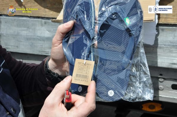 I finanzieri ei doganieri hanno rinvenuto, all’interno di un Tir, 57.600 paia di sandali infradito recanti i segni distintivi contraffatti della nota azienda brasiliana “HAVAIANAS”, destinati ad una ditta di un soggetto di nazionalità cinese con sede a Napoli.