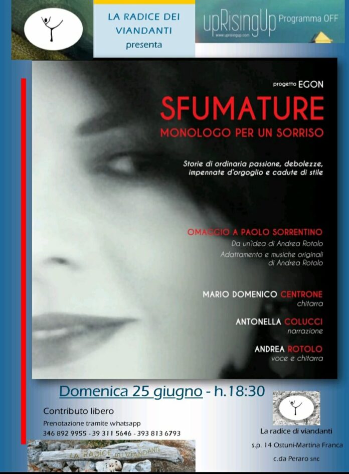 nel contesto di upRisingUp Festival – programma OFF a cura di Manuela Martella, Francesca Pedullà e Roberta Messa e con il supporto dell’associazione La Radice dei Viandanti sarà presentato “Sfumature”, monologo per un sorriso.
