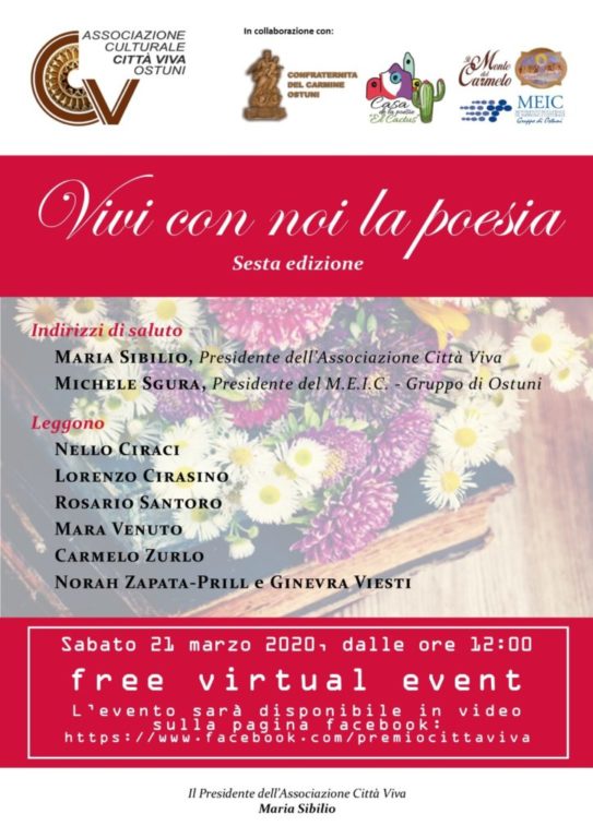 Alle ore 12 di oggi, sabato 21 marzo, sarà mandato in onda sulla pagina Facebook dell’associazione un video in cui vengono declamate le poesie scelte per raccontare il nostro tempo. L’incontro virtuale verrà aperto dai saluti di Mary Sibilio, presidente dell’associazione “Città Viva”, e di Michele Sgura, presidente del MEIC di Ostuni. A dare volto, voce e anima alle composizioni liriche ci saranno Nello Ciraci, Lorenzo Cirasino, Rosario Santoro, Mara Venuto, Carmelo Zurlo, Norah Zapata Prill e Ginevra Viesti.