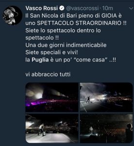“Il San Nicola di Bari pieno di Gioia è uno Spettacolo Straordinario!! Siete lo spettacolo dentro lo spettacolo!! Una due giorni indimenticabile. Siete speciali e vivi! la Puglia è un pò ‘come casa’..!! vi abbraccio tutti”, questo il testo del post che ha mandato in visibilio i fan pugliesi.