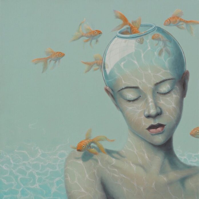 Questa volta però l’artista rinuncia parzialmente all’ironia giocosa che contraddistingue la sua cifra pittorica e regala opere ritraenti donne silenti immerse in bocce di vetro che, circondate da pesci e isolate dal mondo, fluttuano in una loro realtà interna, protetta da quella esterna. Queste donne infatti vivono vite parallele, surreali, in compagnia di effimeri surrogati, compensativi di una vita che soddisfacente non è. Ma la propensione è quella dell’evoluzione per cui queste donne, fluide e silenti come pesci, trovano il coraggio di ascoltarsi, di mettersi in discussione e di affrontare se stesse, percorrendo il difficile cammino dell’autenticità e diventano, attraverso delicate e vitree nuances dai toni marini, un tutt’uno con i pesci stessi.