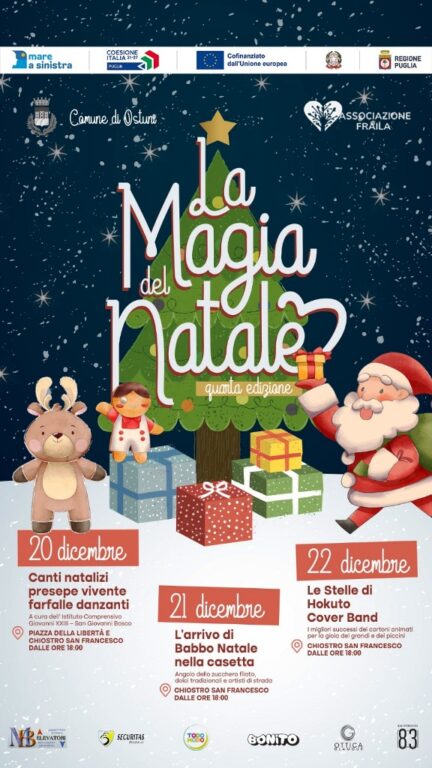 Anche quest’anno torna, ormai come tradizione, l’appuntamento che mette al centro i bambini e le famiglie: “La Magia del Natale”. Giunto alla sua quarta edizione, l’evento è realizzato dall’associazione FRAILA con il supporto del Comune di Ostuni – Assessorato alle Politiche Sociali e Giovanili.