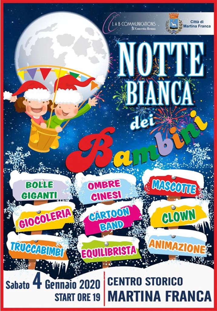 Ritorna nel centro storico di Martina Franca l’allegra brigata de “La Notte bianca dei Bambini”, che si terrà sabato 4 gennaio in piazza e nel centro storico cittadino a partire dalle ore 19. Organizzato da Lab Communications di Concetta Renna e promosso dal Comune di Martina Franca – Assessorato al Turismo, l’evento rientra nel calendario degli appuntamenti natalizi e si sviluppa lungo una ricca scaletta di spettacoli e attività dedicate ai bambini.