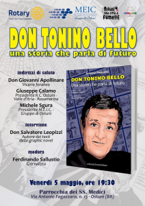 La nobile e santa figura di Don Tonino Bello, a trent’anni dalla sua scomparsa, sarà ricordata ad Ostuni, venerdì 5 alle 19.30, nel salone della Chiesa dei Santi Medici, con la presentazione di un libro a fumetti “Don Tonino Bello: una storia che parla di futuro” pubblicato da Edizioni La Meridiana, con i disegni di Adriano Pisanello e i testi di Don Salvatore Leopizzi, confratello e collaboratore di Don Tonino.