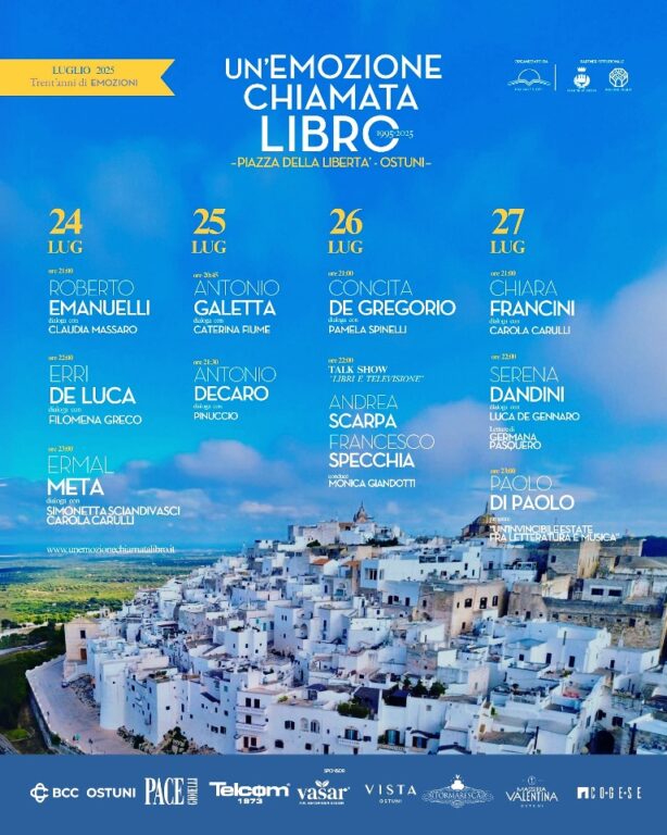 La manifestazione si svolgerà, anche negli anni a venire, nell’ultimo weekend di luglio e sarà concentrata intorno a quei giorni, consolidando la sua identità estiva. Allo stesso tempo, continueremo a mantenere un ruolo attivo durante tutto l’anno, come abbiamo già dimostrato nei mesi scorsi con incontri e presentazioni che hanno visto protagonisti personalità del calibro di Bernardo Mattarella, Roberto Garofoli, Giovanni Grasso, Carlo Cottarelli, Mauro Mazza, Enzo Amendola e molti altri. “Un’emozione chiamata libro” continuerà così a essere non solo un appuntamento culturale consolidato, ma anche uno spazio vivo, dinamico e partecipato, che valorizza Ostuni e il suo territorio attraverso la forza delle idee e delle parole».