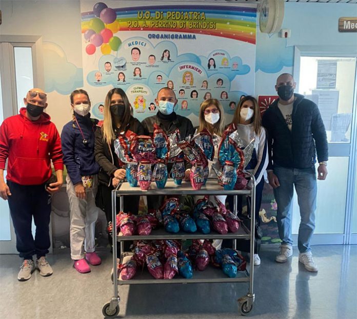Una delegazione di Uniti per lo sport insieme al maestro Carmine hanno donato, attraverso i responsabili dell’Unità Operativa di Pediatria del Presidio Ospedaliero “Di Summa-Perrino” di Brindisi, un uovo di Pasqua a testa per ogni bambino che sarà costretto a trascorrere tra le corsie ospedaliere il giorno che ricorda la resurrezione di Gesù e le altre festività di questo periodo dell’anno che per molti rappresentano motivo di gioia.