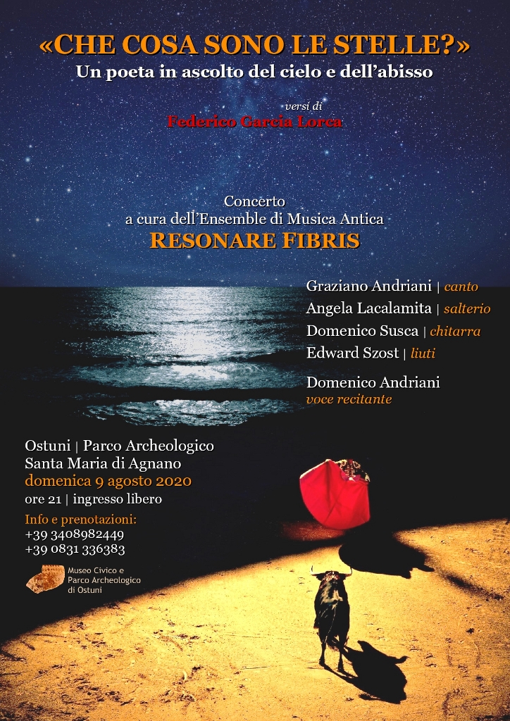 Il concerto-reading “Che cosa sono le stelle? Un poeta in ascolto del cielo e dell’abisso” nasce dalla volontà di sperimentare l’unione tra la poesia di Federico Garcia Lorca e la musica antica, colta e popolare, di un’epoca precedente a quella in cui visse il poeta, in parte sopravvissuta nella coscienza collettiva (è il caso, ad esempio, del folclore musicale spagnolo, antico di secoli ma ancora vivo all’epoca di Lorca che, musicista provetto qual era, allo studio dei cancioneros e alla raccolta del patrimonio popolare dedicò buona parte delle sue energie), in parte dimenticata nel flusso incessante, e sempre improntato al nuovo, della creazione musicale attraverso i secoli (è il caso della musica colta e d’autore). Ecco quindi che se da un lato l’accostamento dei versi di Lorca a una canción popular andalusa non è inconsueto, anzi è suggerito dall’intima affinità di quelli, nei temi e nella scrittura, con i motivi e i moduli musicali del canto folclorico, dall’altro lato molto più insolito e ardito è stabilire corrispondenze e assonanze tra una poesia di Lorca e un canto trobadorico medievale o un mottetto rinascimentale del grande Josquin Desprez. Anche in questo secondo caso, però, il risultato è emozionante, garantito non solo dalla sensibilità musicale che permea la scrittura lorchiana, ma anche dalla grande spiritualità e dall’inesausta tensione verso l’infinito che l’accomuna ai capolavori della musica colta. Una voce recitante declama le poesie di Lorca.
