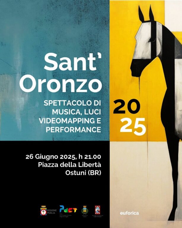 Un mix originale e coinvolgente, ideato da Euforica APS e realizzato da SIRA Videodesign, che vedrà protagonisti i Cavalieri della Cavalcata di Sant’Oronzo, l’Associazione Giovani Musicisti di Ceglie Messapica, i performer della compagnia Creatura Dance Research e l’imponente scultura in ferro dell’artista Luca Palma. Un evento unico che unisce tradizione, arte contemporanea e tecnologie multimediali, proiettando la storia di Ostuni in una dimensione nuova e suggestiva.