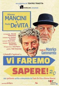 Torna in scena in Puglia uno spettacolo che ha debuttato in teatro 32 anni fa e che portava la firma del grande attore e regista Manrico Gammarota. I protagonisti sono sempre gli stessi, Mimmo Mancini e Paolo De Vita, i Fratelli Capitoni. Dopo aver calcato i palcoscenici dei teatri di Bitonto, San Vito dei Normanni e Barletta, “Vi faremo sapere 2.0” andrà in scena domani, 4 aprile, al Teatro Roma di Ostuni.