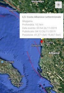 Stando a quanto riporta l’istituto nazionale di geofisica e vulcanologia, sono le ore 3.54 di oggi, martedì 26 novembre, quando un terremoto di magnitudo 6.5 della scala Richter, con epicentro nei pressi di Durazzo a una profondità di 10 chilometri, si è abbattuto sull’area settentrionale dell’Albania, riverberandosi fino in Puglia.