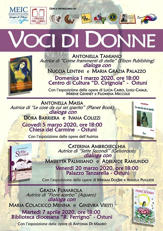 Dopo il successo del primo incontro prosegue “Voci di donne“, la rassegna dedicata all’universo femminile promossa dal gruppo MEIC (Movimento Ecclesiale di Impegno Culturale) di Ostuni e dal Presidio del Libro in collaborazione con Centro di Cultura “D. Cirignola“, Ass. culturale “Città Viva“, Associazione Post.It, Casa de la Poèsie, Lions club Ostuni Host, Biblioteca diocesana “R. Ferrigno” ed Espressioni d’Arte.
