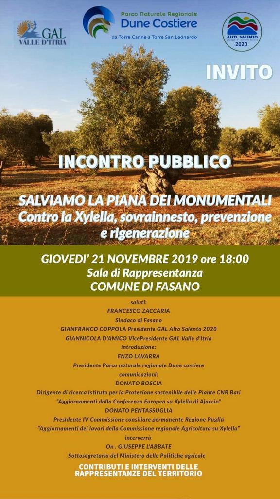 Salviamo la Piana dei Monumentali. Contro la Xylella, sovrainnesto, prevenzione e rigenerazione”: sarà questo il tema dell’incontro organizzato dal Parco naturale regionale delle Dune costiere, in collaborazione con il Gal Valle d’Itria e con il Gal Alto Salento 2020, che si terrà domani alle ore 18 presso la Sala di Rappresentanza del Comune di Fasano.